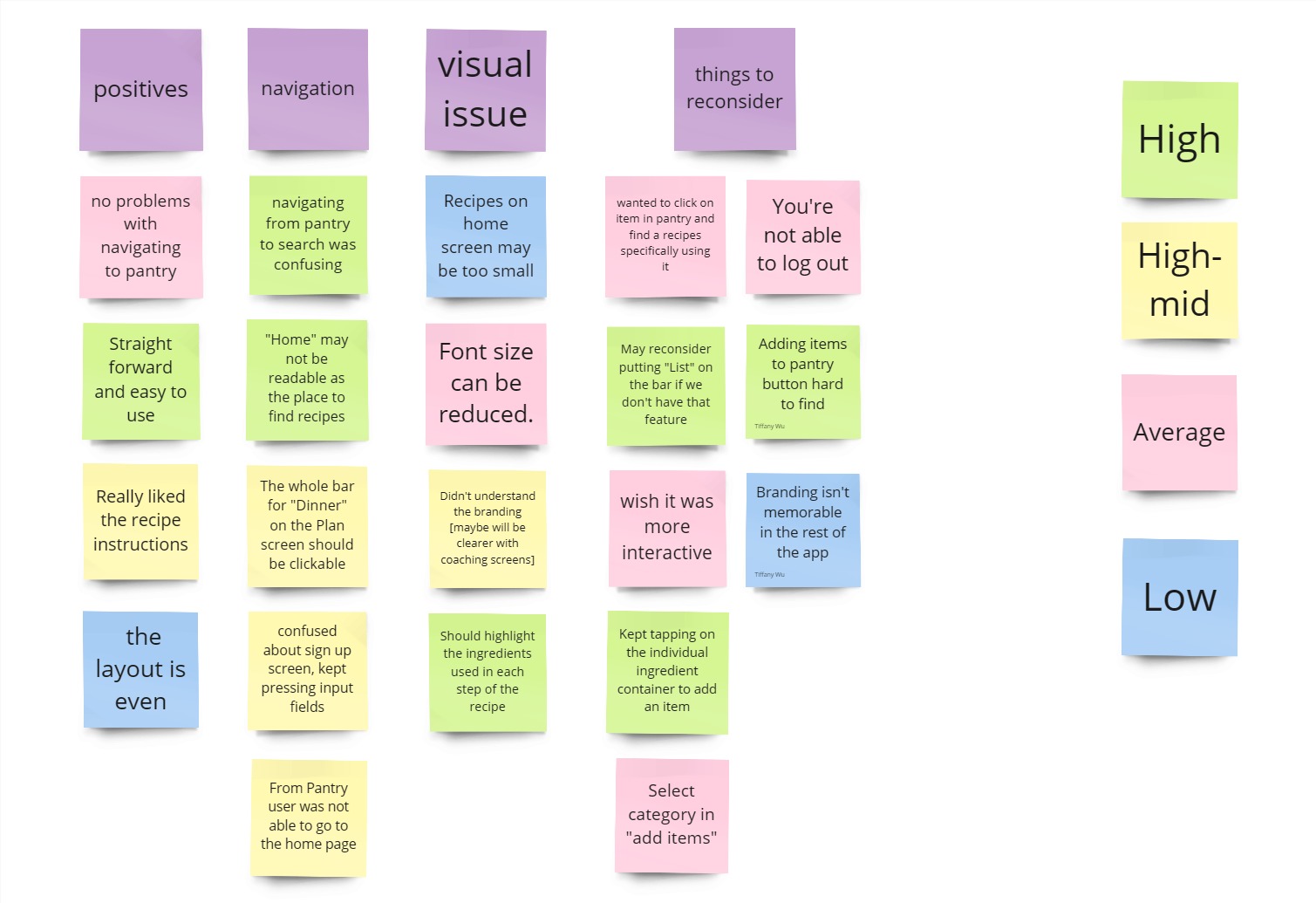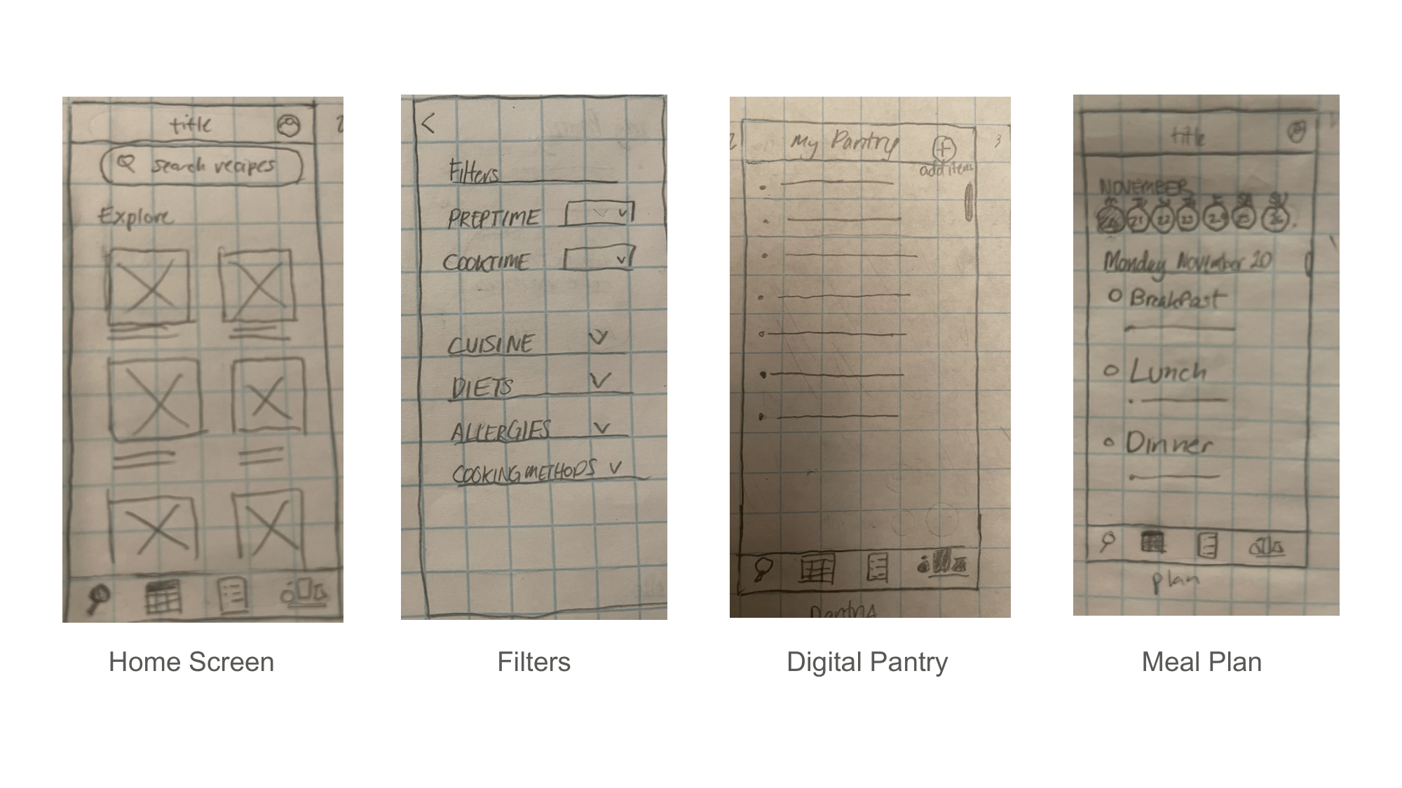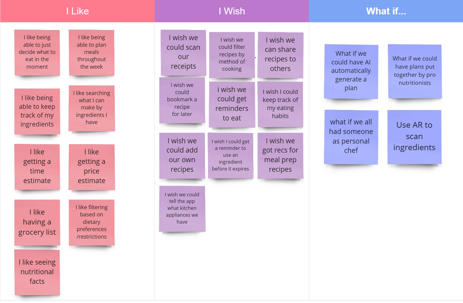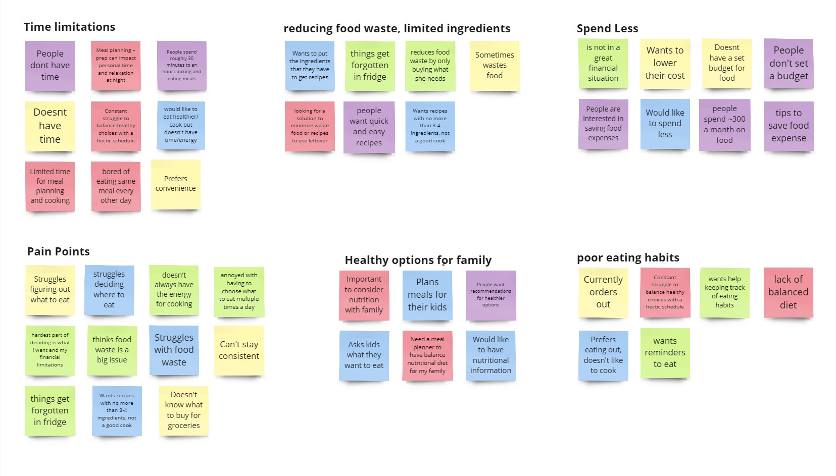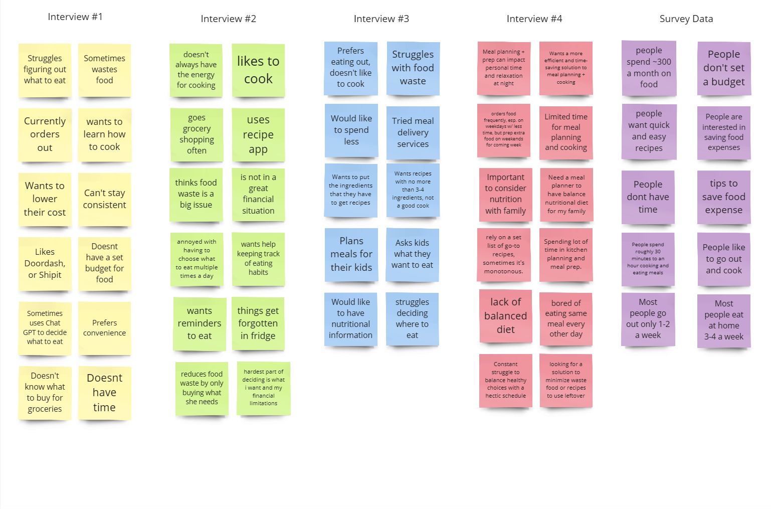 We conducted five one-on-one user interviews. Like the survey, we wanted an idea of their habits, budget, and time spent regarding what they eat on a day-to-day basis. We wanted to identify the considerations made and possible pain points in how people plan their meals.