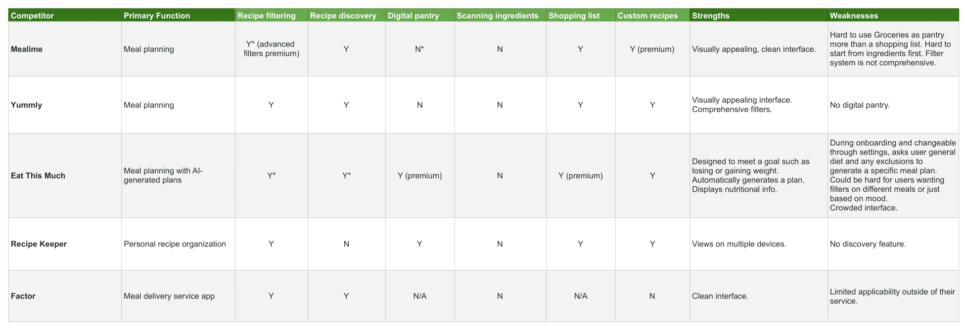 Our direct competitors were similar meal planning mobile apps: Mealime, Yummly and Eat This Much. Our indirect competitors included Recipe Keeper and Factor. Recipe Keeper is a personal recipe organization tool, and Factor is a meal delivery service app.