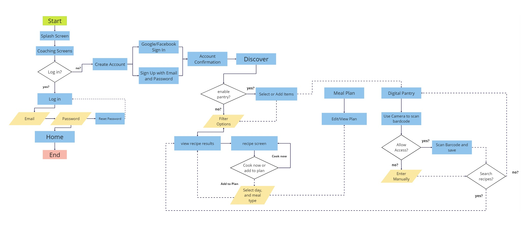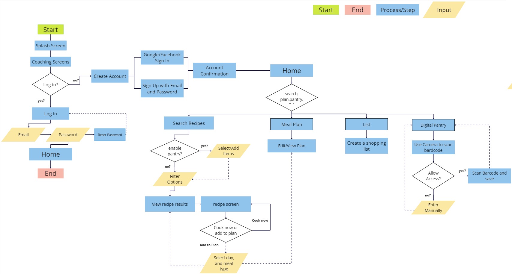 Our first drawing of our user flow takes users from the signup process through all the main features: Sign up, searching recipes, adding ingredients to pantry, creating a shopping list, and planning out meals.