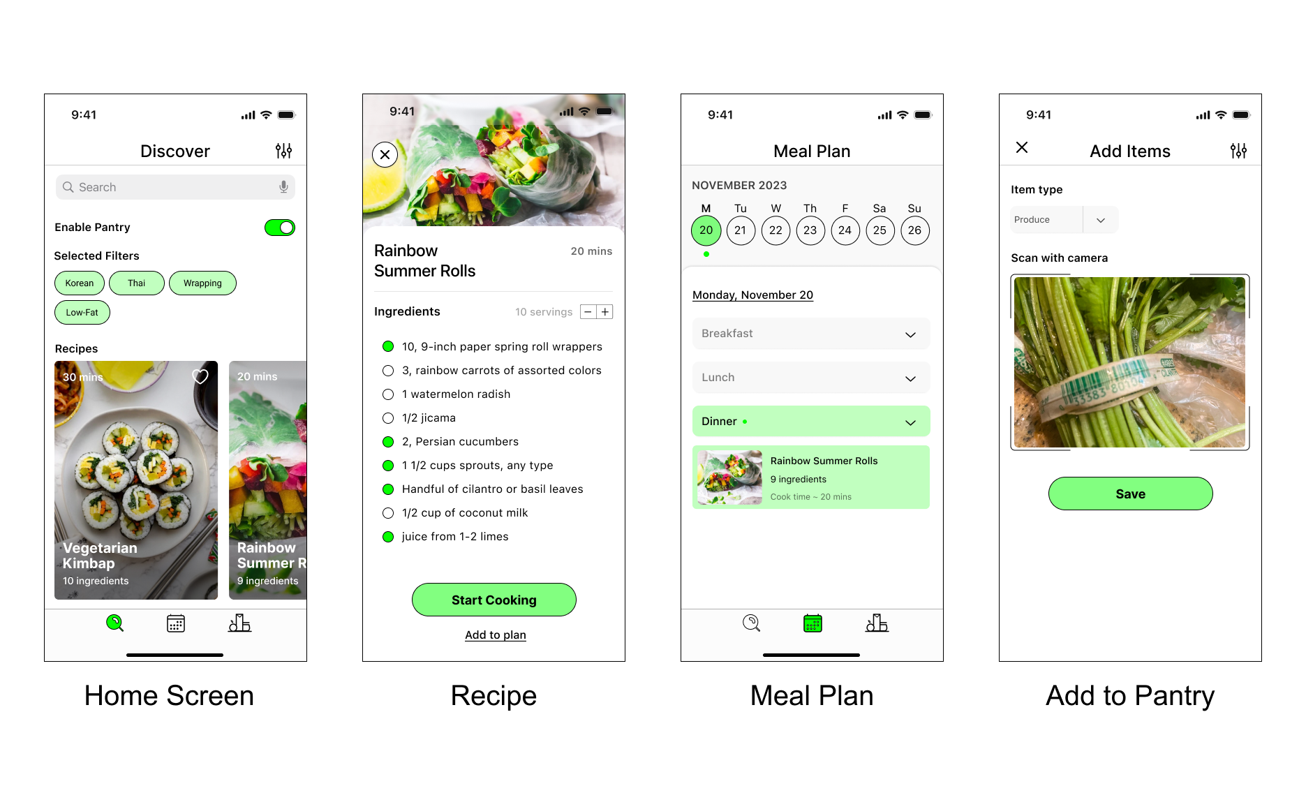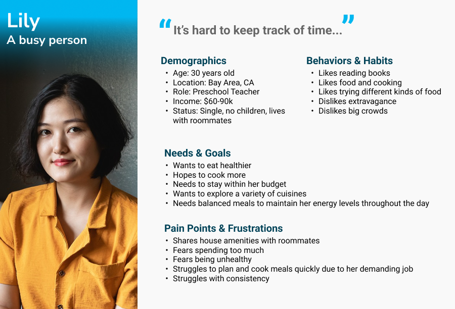 Since we first identified the struggles amongst ourselves, we designed a proto-persona not unlike ourselves: a more introverted person that cooks for themselves, but doesn't have much time and money which makes them struggle to cook more often.