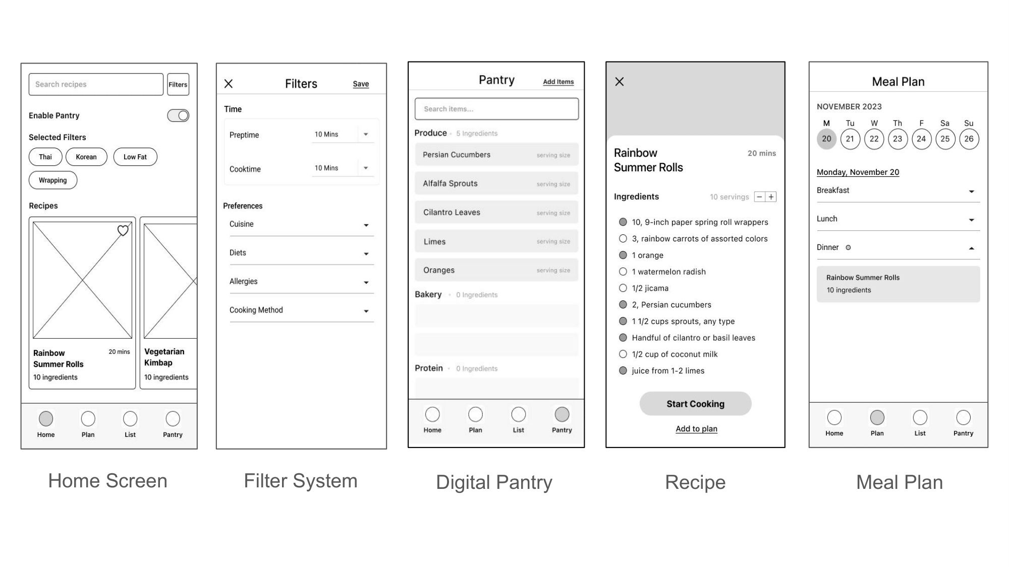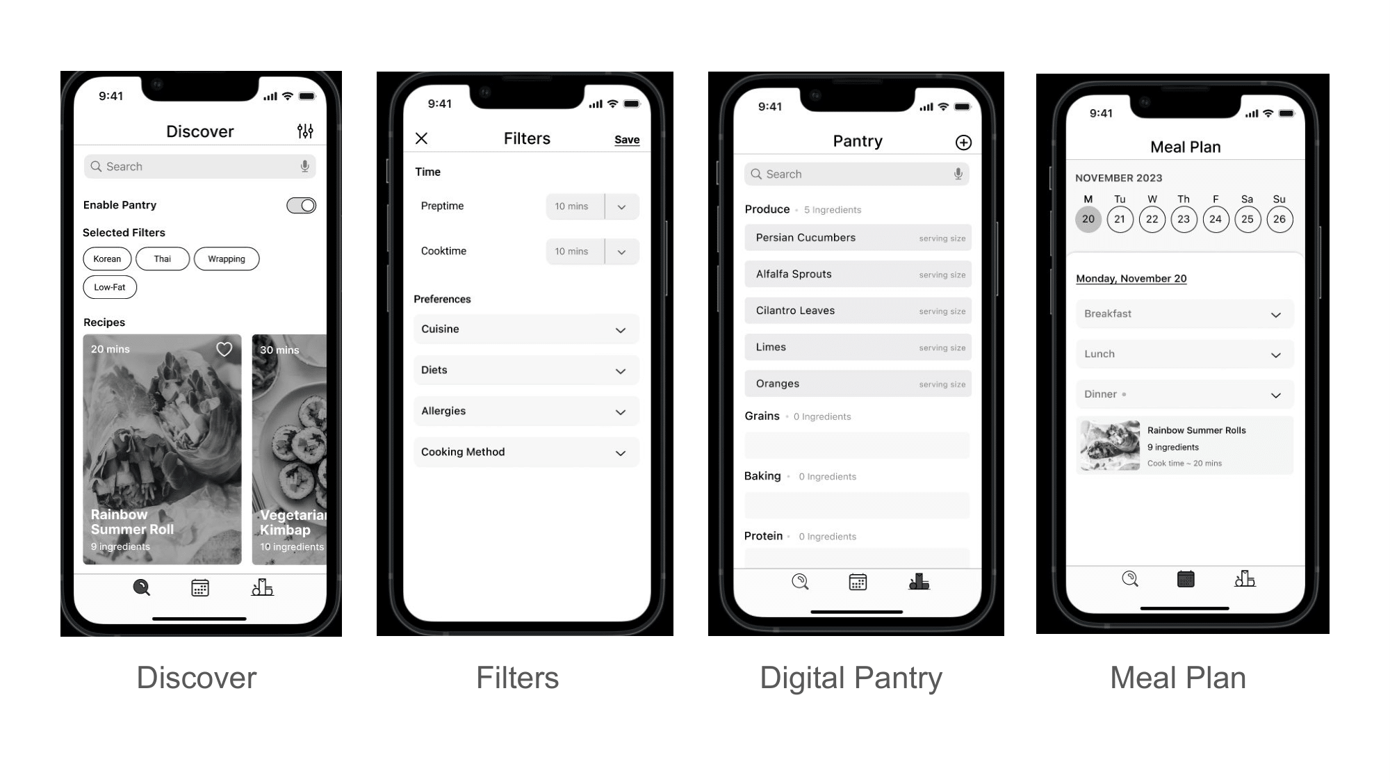 Our next steps would be to fully build out the hi-fidelity prototype, as well as to test and iterate upon it. In the future, we would like to build out the bookmarking feature (hinted at with the heart icon on each recipe card) and add more features such as a shopping list, custom recipes, and community features.