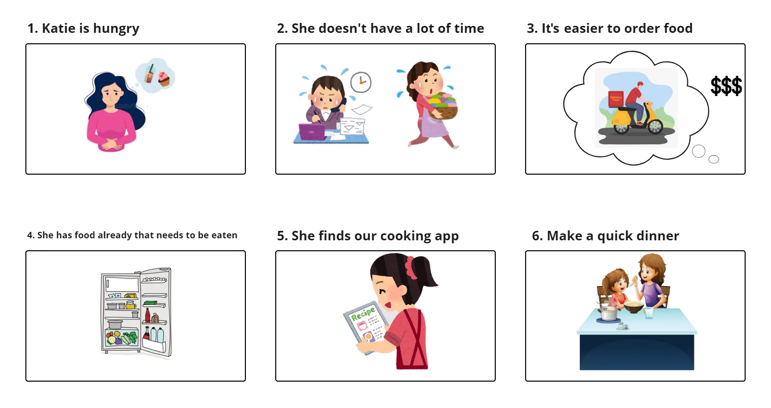We created a story of our user persona, Katie, who faces the problem of feeling hungry and needing to feed herself and her children dinner.
