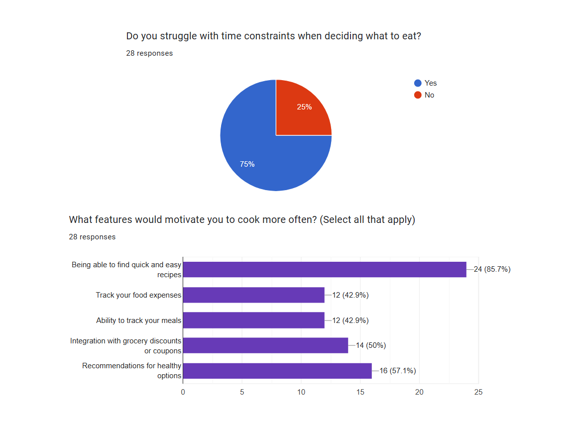 We found that the majority of users struggled with time constraints when deciding what to eat. Being able to find quick and easy recipes was also the most requested feature that would motivate users to cook more often.