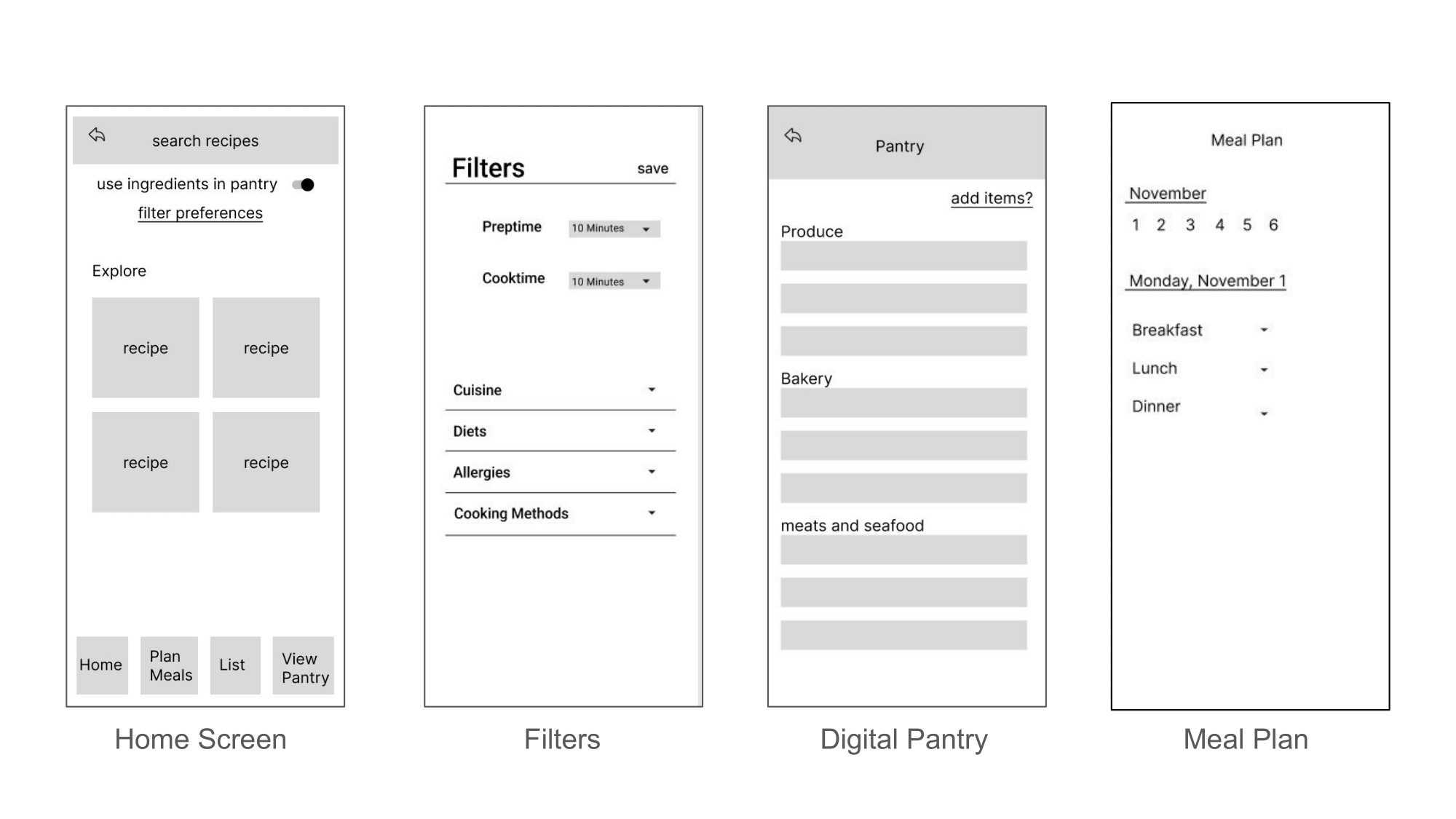 While we took inspiration from Yummly for the specific filter categories users would need when searching for recipes, we also noticed that Yummly did not have a place where ingredients on hand could be stored and remembered (i.e. a "Digital Pantry," "Groceries" screen) like Mealime does.